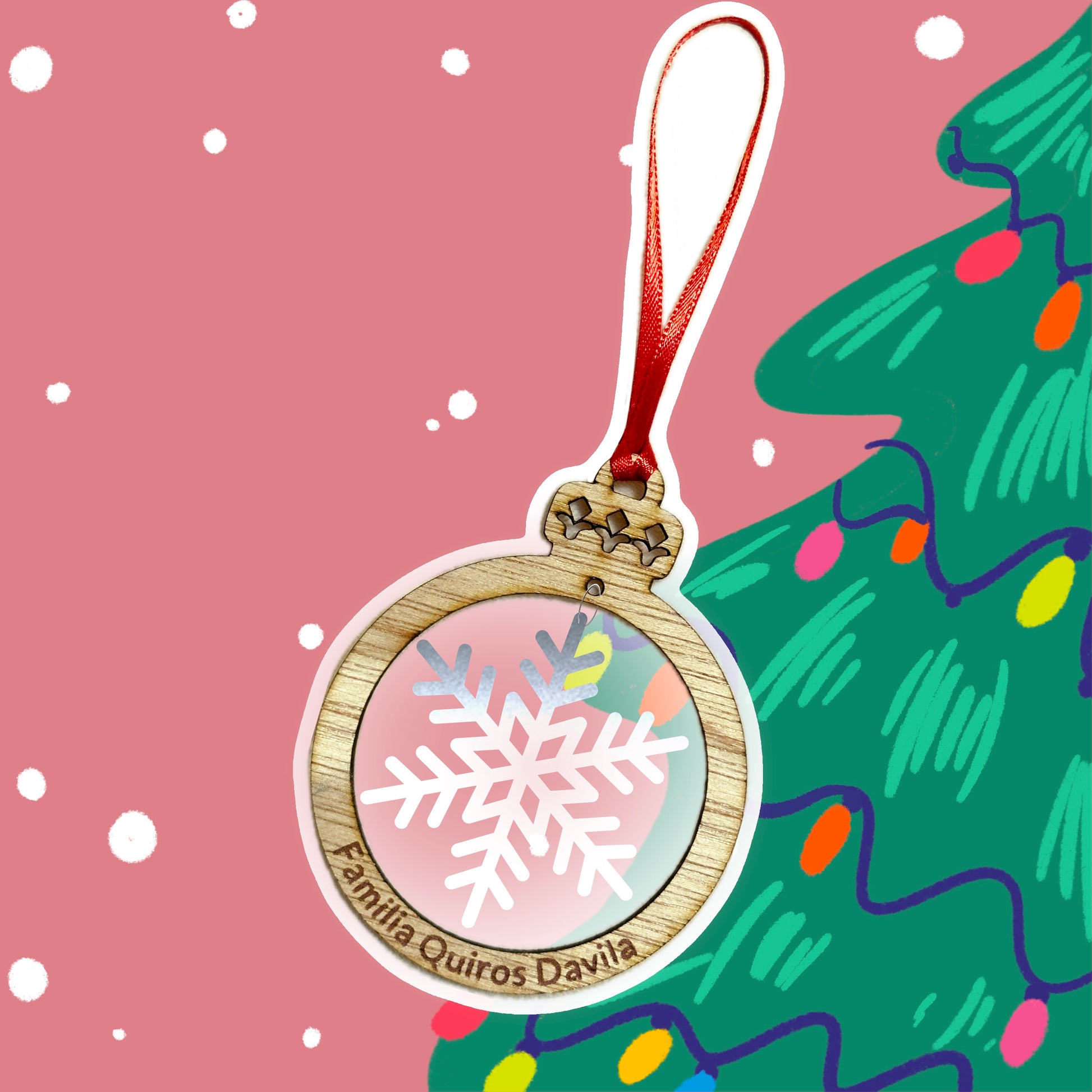 Adornos en forma de bola navideña, personalizados con los apellidos familiares, un copo de nieve en acrilico y un lazo rojo para colgar. Los adornos tendran los apellidos proporcionados por el cliente, dichos apellidos seran grabado tal cual sean proporcionado.